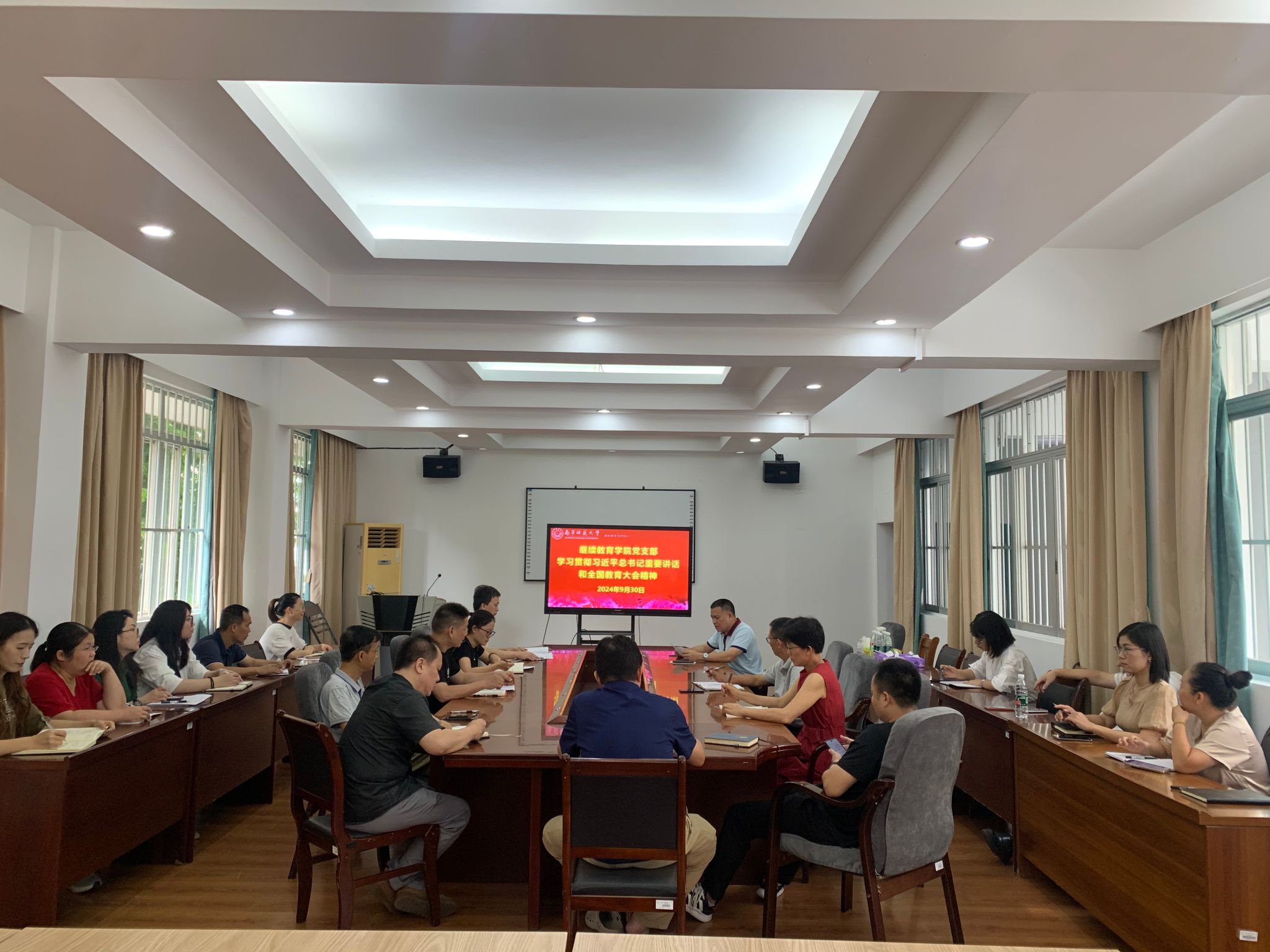 2024年9月30日,继续教育学院党支部在明秀校区地理楼312组织全体党员学习贯彻习近平总书记重要讲话和全国教育大会精神,会议由党支部组织委员陈武荣同志主持。