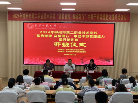 受柳州市第二职业技术学校委托,8月24-26日,BET体育365登录入口顺利举办2024年柳州市第二职业技术学校“蓄势赋能 奋楫笃行”中层干部管理能力提升培训班。来自柳州市第二职业技术学校的54位中层干部参加了本次培训。