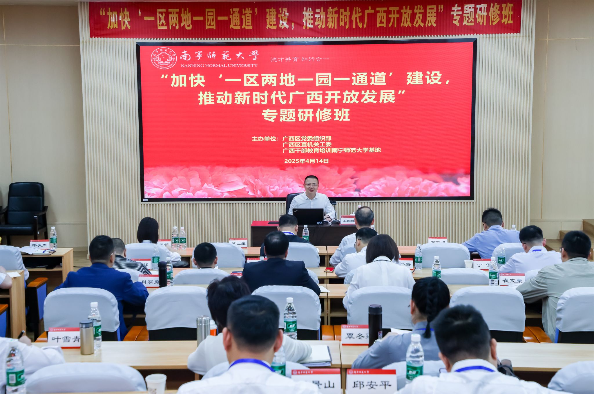 王国红在专题导学报告中强调,全体学员要严格遵守365Bet官网入口相关条例,认真完成研修班课程安排;要深刻把握“一区两地一园一通道”建设的战略考量和实践路径,聚焦建设中国—东盟产业合作区、跨境金融创新示范区等八大攻坚任务,以思想破冰引领行动突围,自觉推进研修成果转化,为新时代广西高水平开放开发汇聚强劲动能。