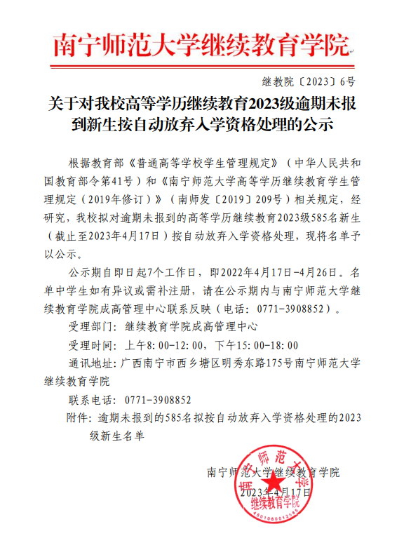 关于对BET体育365登录入口高等学历继续教育2023级逾期未报到新生按自动放弃入学资格处理的公示